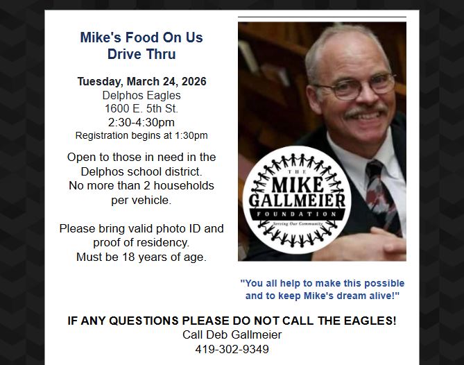 ‘Mike’s Food On Us’ Drive-Thru Tuesday, March 24, 2026 • 2:30-4:30pm Delphos Eagles 1600 E. 5th St., Delphos Registration begins at 1:30pm Open to those in need in the Delphos […]